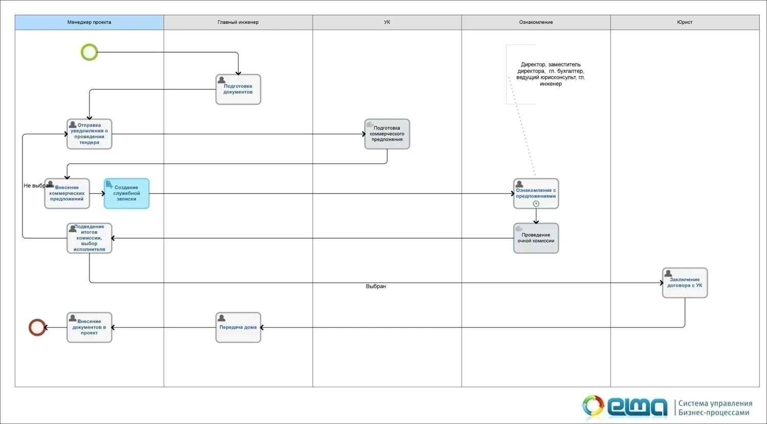 В крупном бизнесе все чаще встречаются отдельные контуры, автоматизируемые с помощью гибких BPM подходов и WorkFlow-подсистем. В качестве примера можно привести бизнес-процесс организации и проведения тендеров, смоделированный и автоматизированный с помощью ELMA BPM для российской нефтедобывающей компании. Проведение тендера – только часть более объемного бизнес-процесса закупок. Тем не менее, как видно из примера, в конкретной нефтяной компании это достаточно внушительный и сложный процесс.