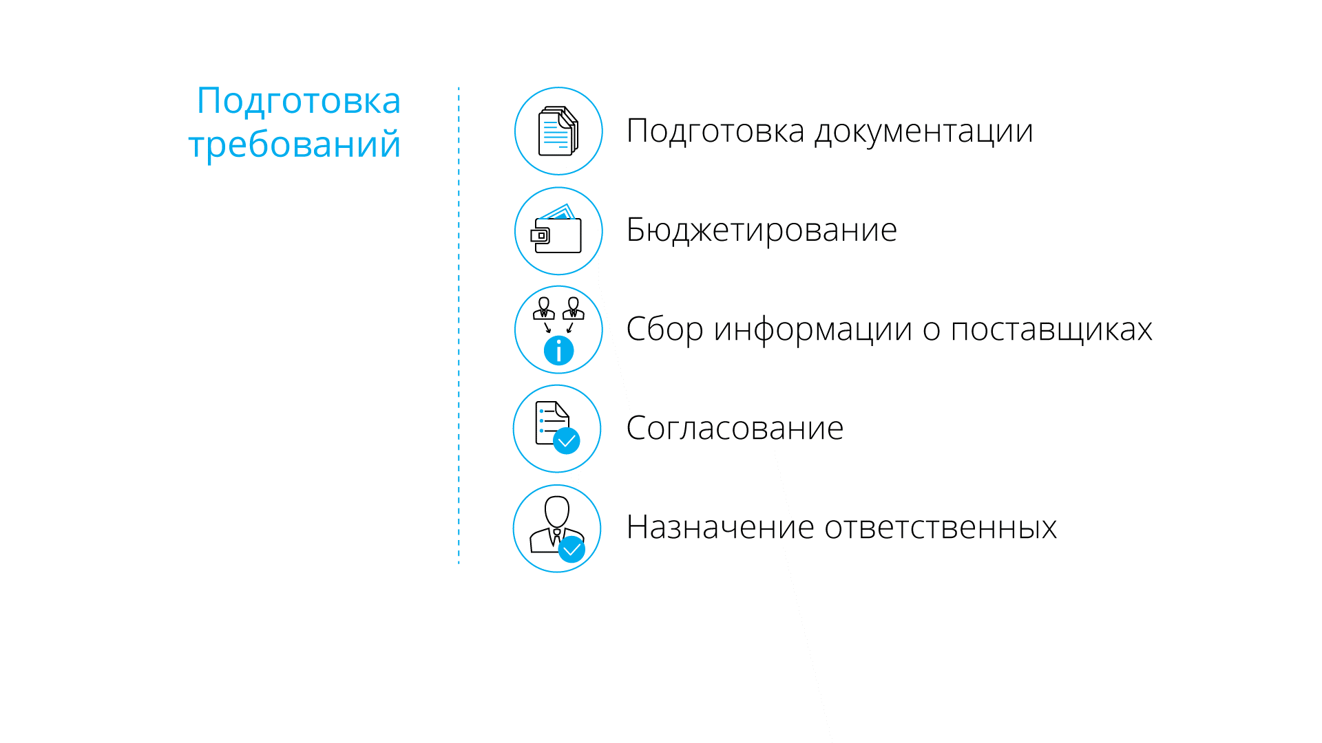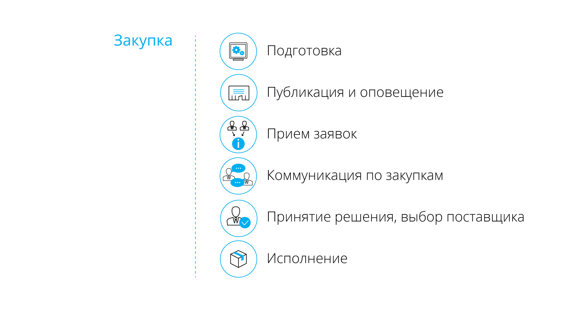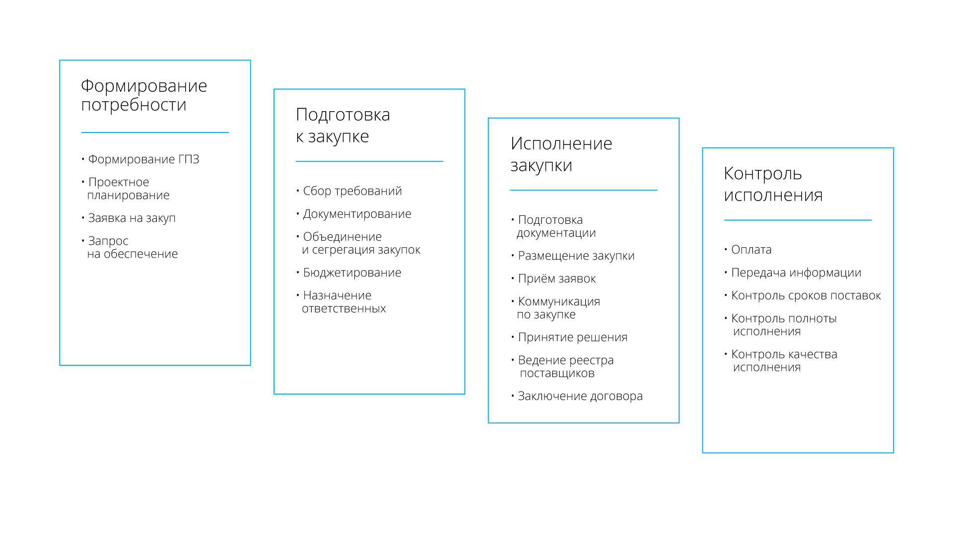 Часто несколько этапов закрываются одним процессом, а иногда все четыре этапа реализуются как единый бизнес-процесс проведения закупки.