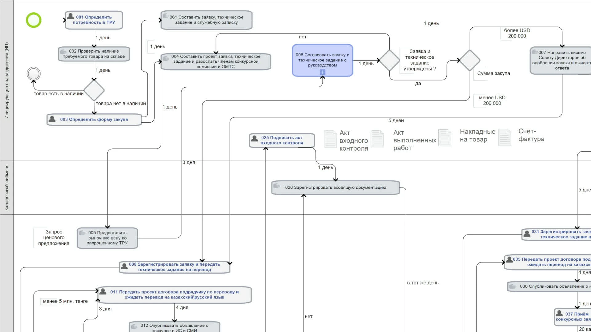 На изображении представлена визуализация процесса проведения тендеров – порядок действий, участники процесса. Это первый шаг к последующей автоматизации бизнес-процесса с добавлением генерации документов, передачи данных в ERP-систему, интеграции с CRM и т.д.