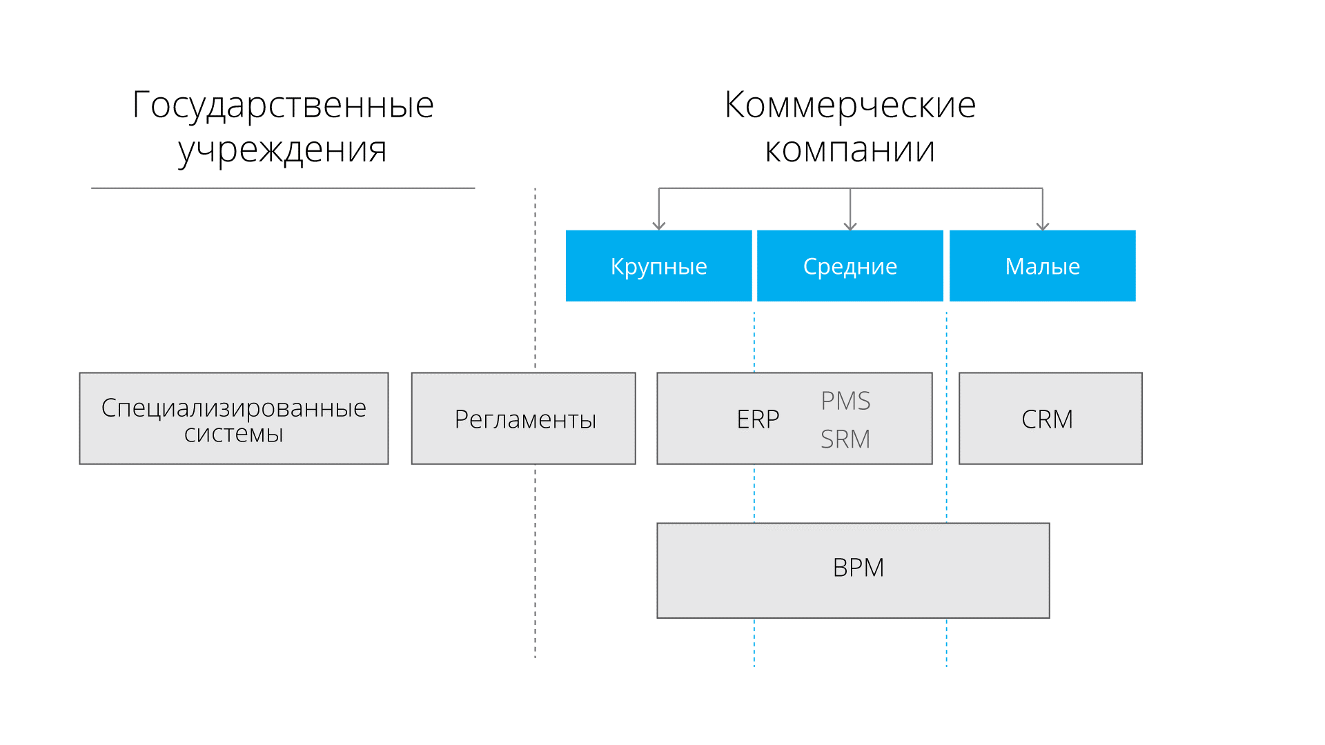 Многие компании, относящиеся к сегменту крупного бизнеса, попадают под регламенты 223-ФЗ о закупках, но реализуют их с иной позиции, учитывая свою коммерческую направленность. В первую очередь, речь идет о госкорпорациях. Работа с регламентным исполнением бизнес-процесса без автоматизации всей цепочки работ широко распространена в крупных компаниях.