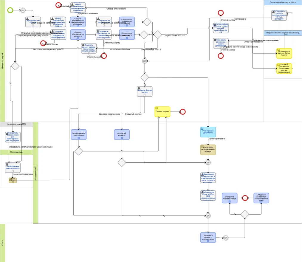 Следующий пример – бизнес-процесс проведения закупки в нефтяной компании, уже автоматизированный в системе ELMA BPM. Каждый синий блок на схеме представляет собой еще один процесс.