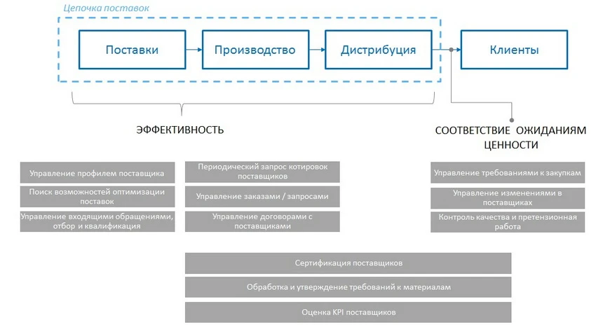 Реализация стратегии снабжения (управление требованиями к закупке, профилем поставщика, поиск вместе с поставщиком возможности оптимизации поставок через личный кабинет).