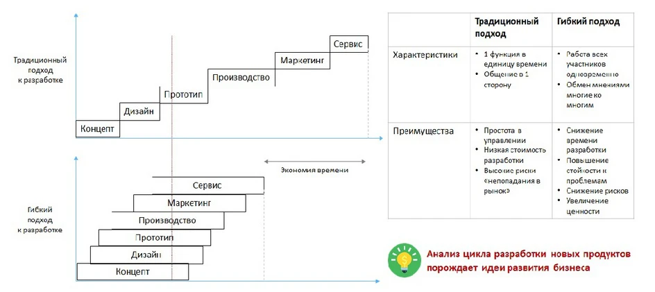 В разработке новых продуктов (концепции, цикла производства, пилотной партии) выделяют два подхода — традиционный и гибкий (или нетрадиционный). Основным показателем обоих является количество идей и прототипов. Отличия же подходов заключаются во времени и способе прохождении шести стадий разработки: генерации концепта, дизайна, прототипирования, производства, продвижения (маркетинга), сервисного обслуживания.