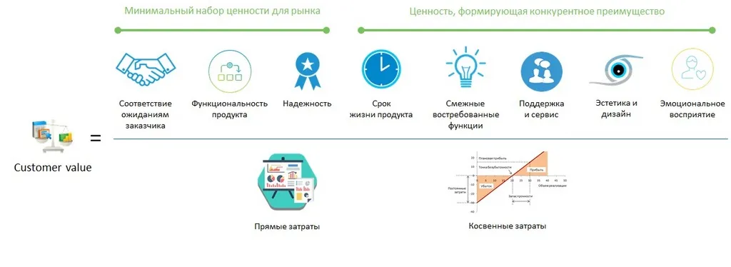 В одном из прошлых материалов мы приводили формулу расчета Сustomer value и говорили о том, что она равна выгодам, поделенным на «жертвы». Получая продукт или услугу, потребитель тратит свои деньги, время, прочие ресурсы в обмен на продукты или услуги. Минимизация «жертвы» происходит за счет грамотного процессного управления и соответствия полученной ценности ожиданиям клиента. Следовательно, чем меньше ресурсов расходует клиент — тем больше эффективность работы компании.