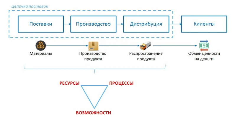 С точки зрения такого подхода, управление цепочкой поставок (закупкой материалов, производством, сетью распределения готовой продукции) — не просто перемещение груза от точки А к точке Б, это важная составляющаяCustomer value. В основе грамотной логистики — синхронная работа всех звеньев цепочки, а также умение руководства создать и донести ценность продукта до конечного потребителя. Достижение же максимальной эффективности и конкурентного преимущества на рынке зависит от наличия у бизнеса необходимого количества ресурсов, постоянного развития процессов и возможностей компании.
