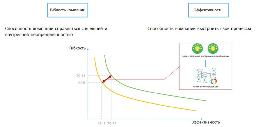 Главную роль в трансформировании бизнеса играет способность компании к операционному обучению, то есть возможность сотрудников непрерывно вести процесс по решению какой-либо проблемы, искать и понимать причинно-следственные связи в операционной деятельности. Допустим, мы изменили что-то в продукте — поставщики и дистрибьюторская сеть начали работать по-другому, появилась реакция от клиентов. Почему она такая? Почему так происходит? Отвечая на эти вопросы, мы создаем знания на операционном уровне. Компетенции агрегируются владельцами процессов, и они в свою очередь меняют бизнес. Таким образом, операционное обучение дает идеи по развитию компании благодаря разноплановому анализу процессов и взаимодействию элементов цепочки поставок. Воплощение этих идей способствует одновременному повышению и гибкости, и эффективности работы.