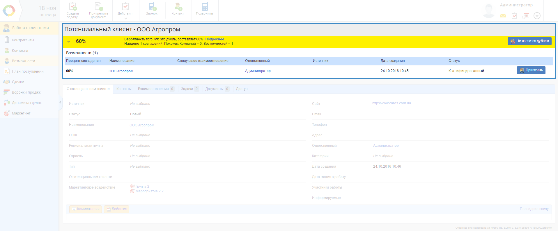 Благодаря тому, что система ELMA является высоко интеллектуальной, она может с легкостью показать Вам все возможные совпадения (даже если они не точные). В версии 3.10 в ELMA CRM появилась функция автоматической проверки возможностей (потенциальных клиентов) на наличие уже существующих в системе аналогичных записей.