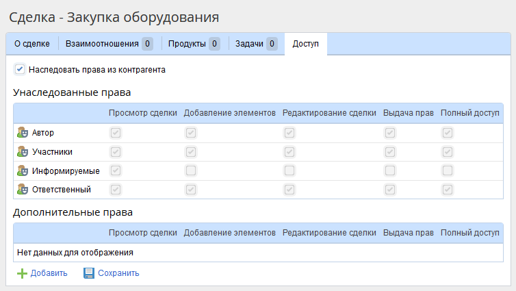 Доработки затронули не только Дизайнер ELMA, но и веб-часть. Для сделок немного изменилась схема назначения прав доступа. Теперь полные права на сделку автоматически выдаются пользователю, ответственному за нее.
