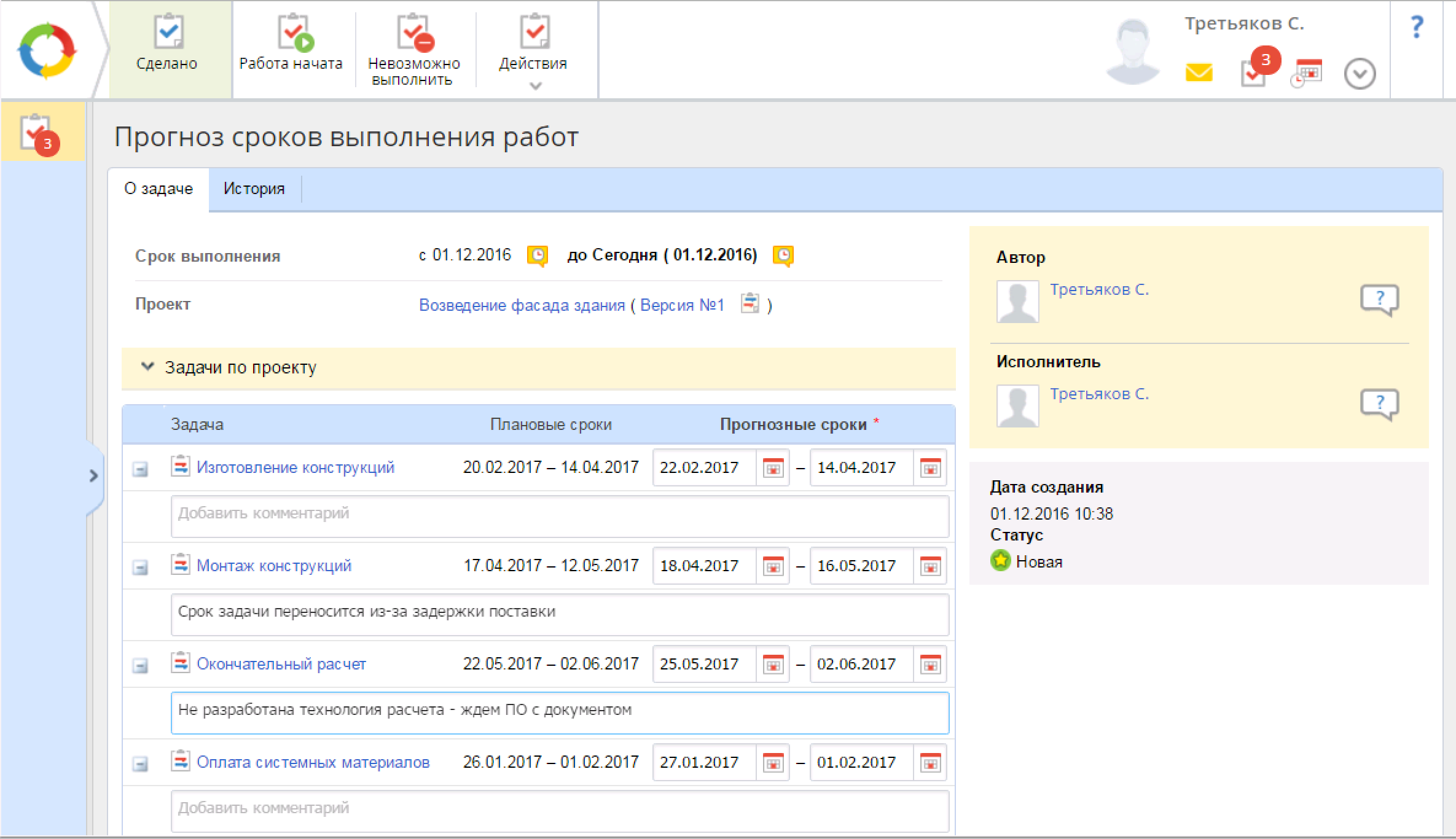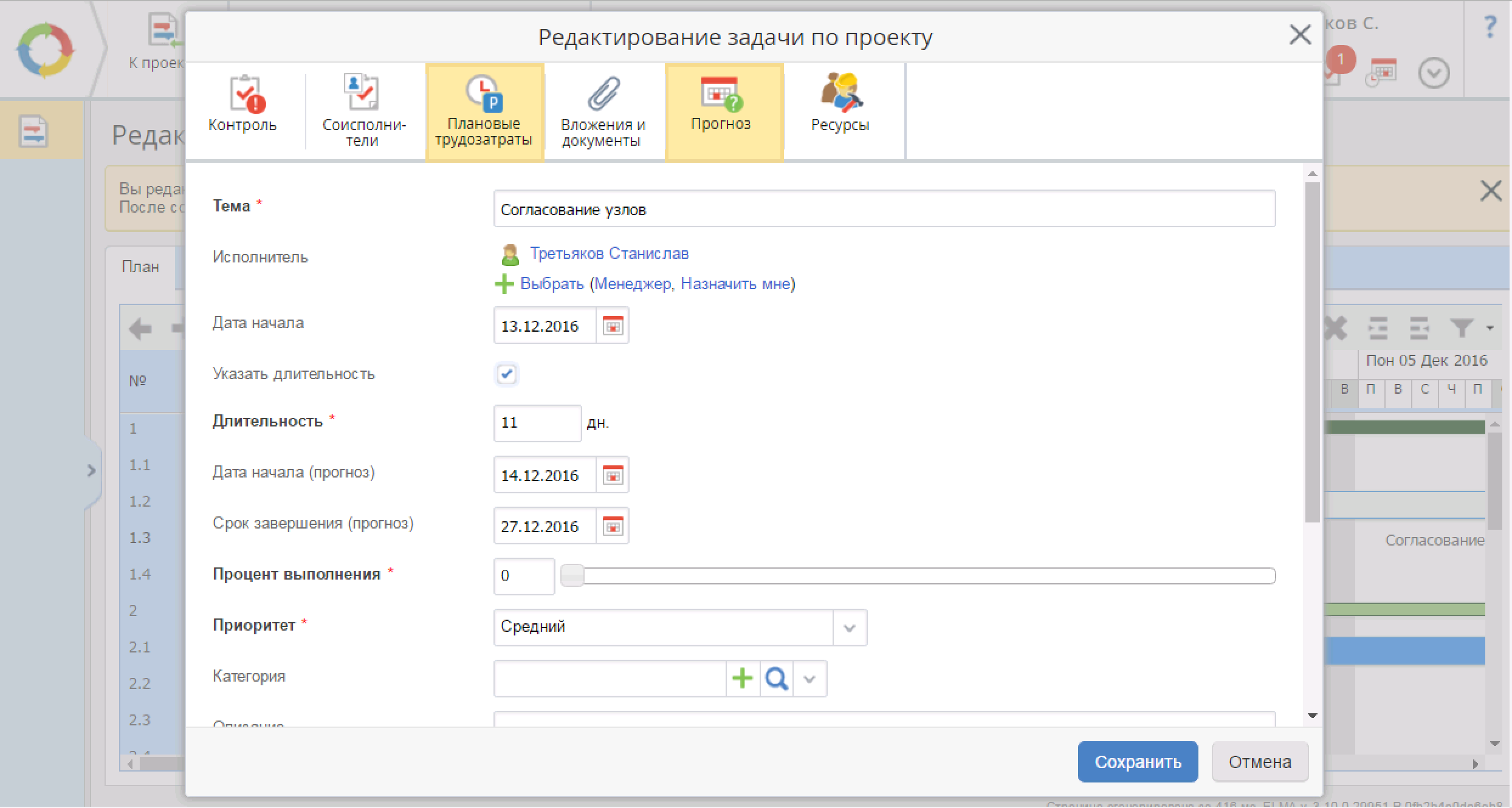 Как же указываются прогнозные даты по задачам проекта? Вариантов несколько. Во-первых, их можно указать при редактировании календарного плана проекта. То есть это может сделать сам менеджер. Однако интереснее другие сценарии, например, сам исполнитель может указать в назначенной на него задаче свой прогноз по ее исполнению.