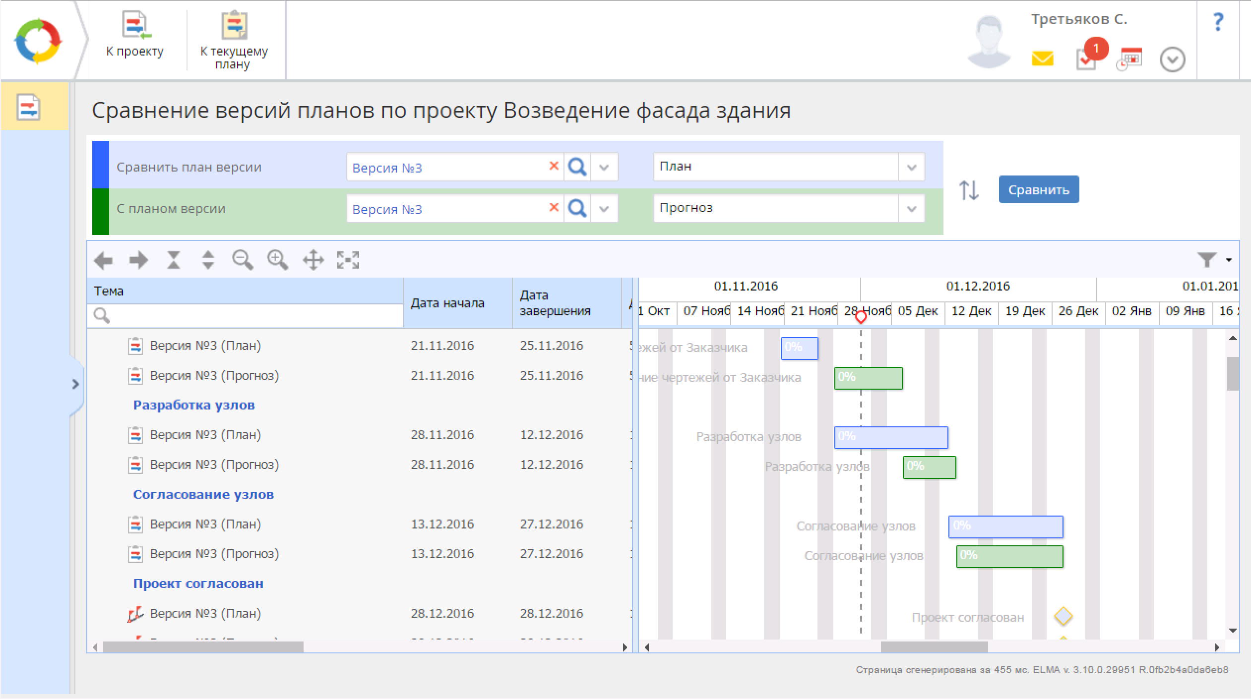 Также мы реализовали инструмент, при помощи которого можно сравнивать различные версии плана проекта. С его помощью можно сравнить изменения в календарном плане проекта, расхождения между плановыми и прогнозными датами, расхождения между актуальным утвержденным календарным планом и прогнозом по исполнению от непосредственных участников проекта и т. д.