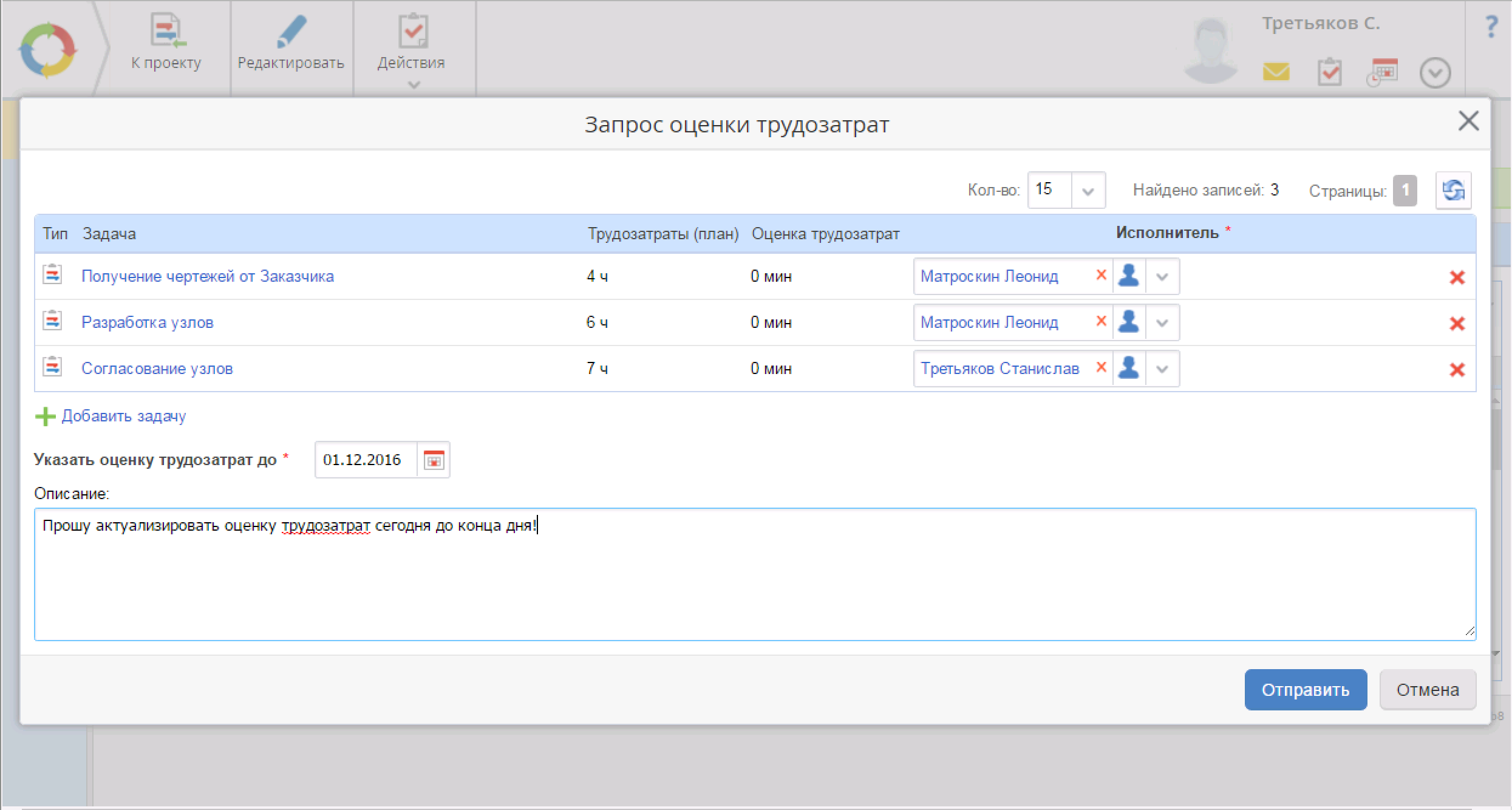 Пожалуй, самый интересный сценарий использования этой новой функции – запрос прогнозов исполнения. Менеджер проекта может в несколько кликов мышки запросить у всех исполнителей по всем активным невыполненным задачам проекта прогноз. При этом можно попросить указать не только прогнозные сроки, но и прогнозные трудозатраты.