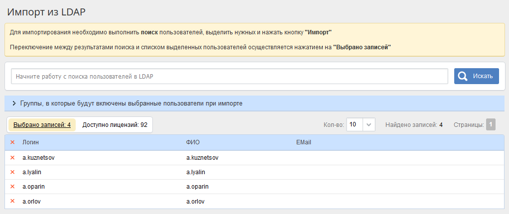 Кроме того, теперь Вам не нужно думать о том, хватит ли Вам лицензий для импорта пользователей. Количество свободных лицензий отображается прямо на странице импорта и изменяется в режиме реального времени при выборе пользователей для импорта.