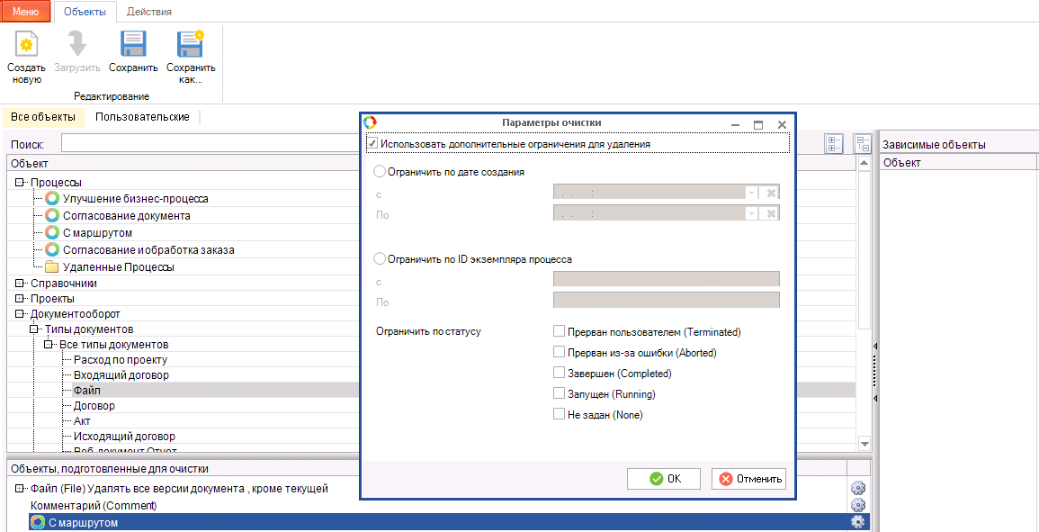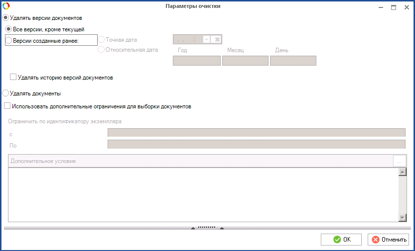 К версии 3.10 мы усовершенствовали данную утилиту – добавилась возможность удаления типов документов с различными ограничениями. Например, можно удалить целиком документ или только его версии, созданные ранее заданной даты и др.