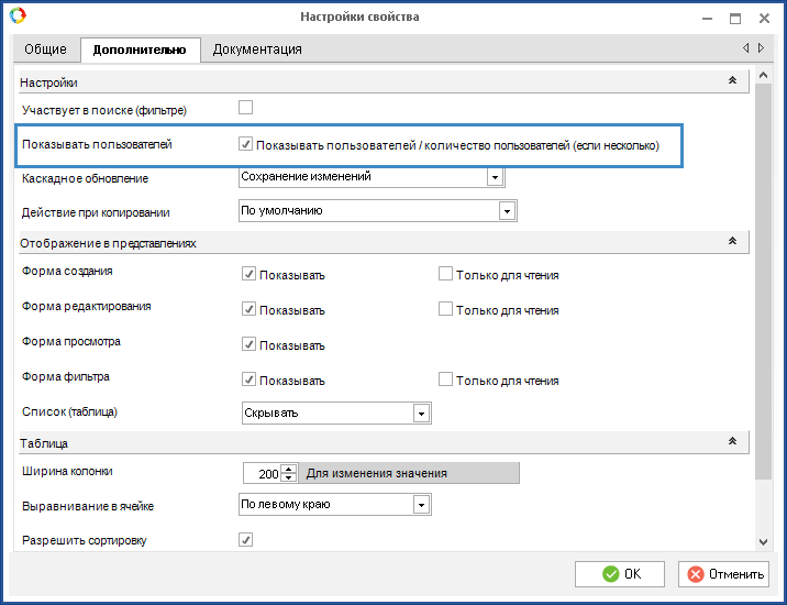 Также несколько изменений связаны с объектом «Оргструктура». При необходимости в настройках требуемого свойства можно включить отображение пользователей, назначенных на должность, или их количество для выпадающих списков.