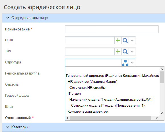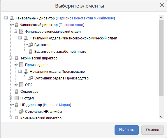 Помимо этого, на форме поиска при работе с оргструктурой реализовано ее иерархическое отображение. Это поможет Вам легко и быстро сориентироваться и найти требуемый элемент.