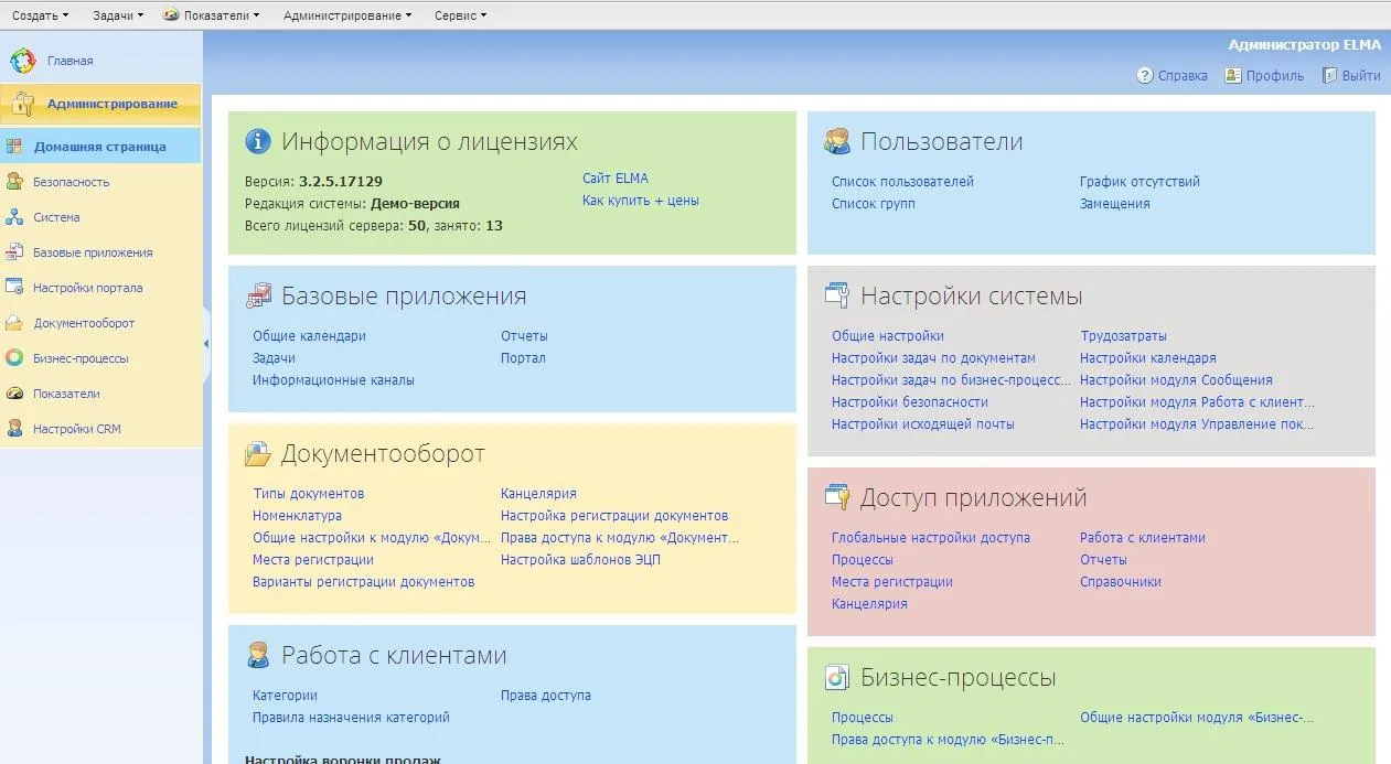 Рис. 1. Панель настроек на странице администрирования в системе ELMA KPI