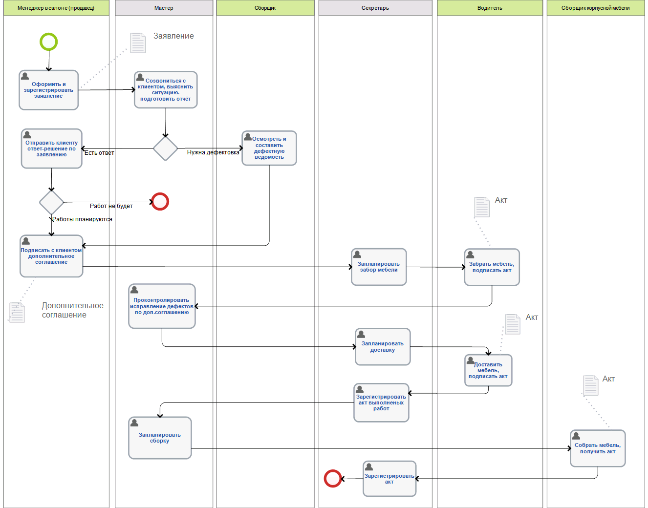 Процессы работы с Заявлениями клиентов (процедуры доработки, переделки и работы по претензиям) и Заказа корпусной мебели (контроль производственных процедур) были выявлены руководителем компании «Ваша мебель» как наиболее приоритетные для реализации стратегического плана развития компании. За счёт формализации и оптимизации этих процессов, по мнению руководства, решаются следующие задачи: