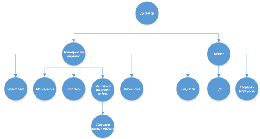 Компания ООО «Ваша мебель» имеет небольшой штат сотрудников, некоторые из которых выполняют довольно большой функционал и несут усиленную ответственность за правильное и своевременное исполнение заказов.