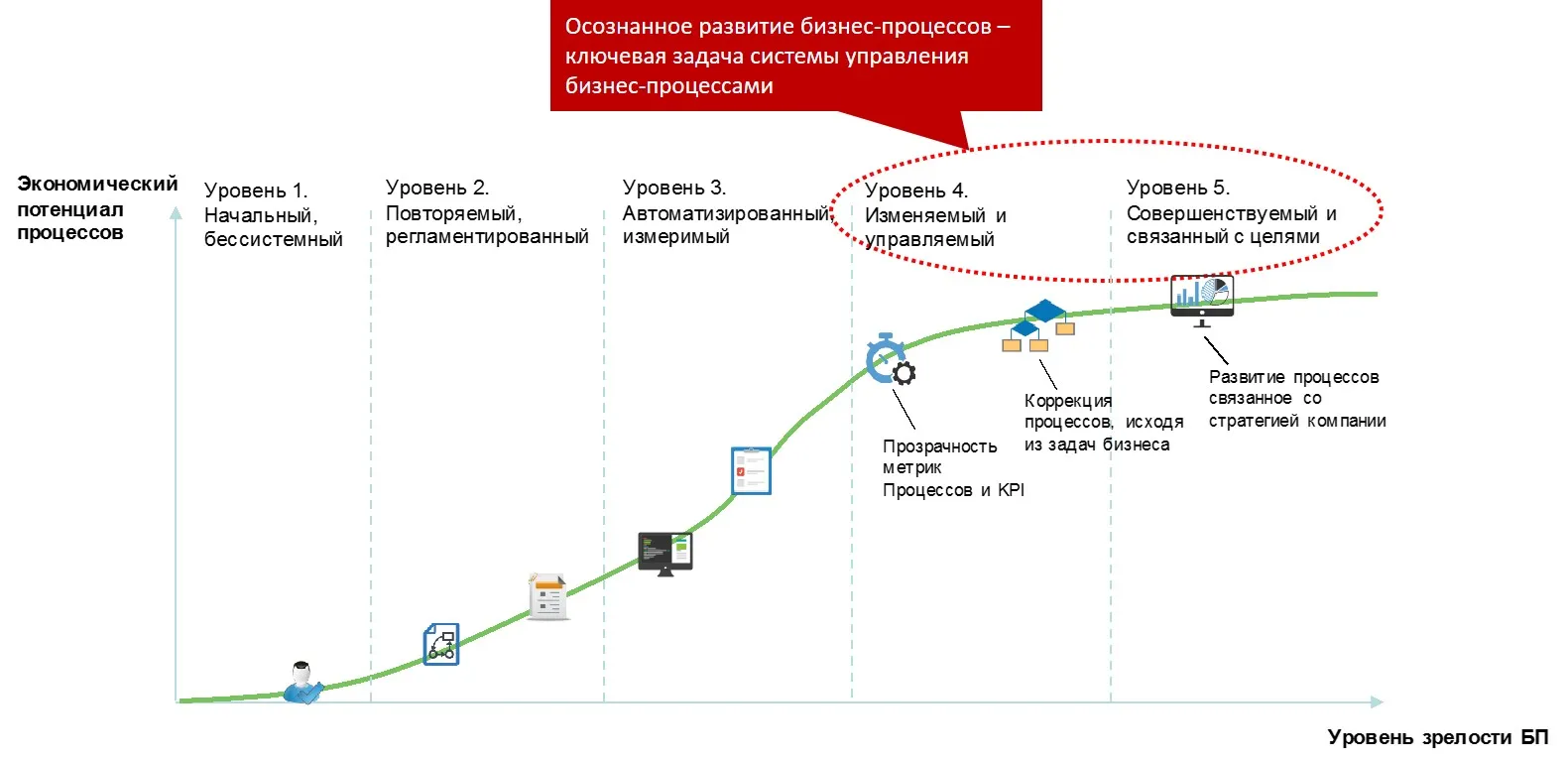 Система управления бизнес-процессами концентрируется именно на 4 и 5 уровнях зрелости. Если в компании есть ERP либо учетная система, это хорошо, но это только часть управления процессами предприятия. Основная задача системы управления бизнес-процессами — развитие процессов, которое позволяет увеличить экономический потенциал с операционной и стратегической точек зрения.