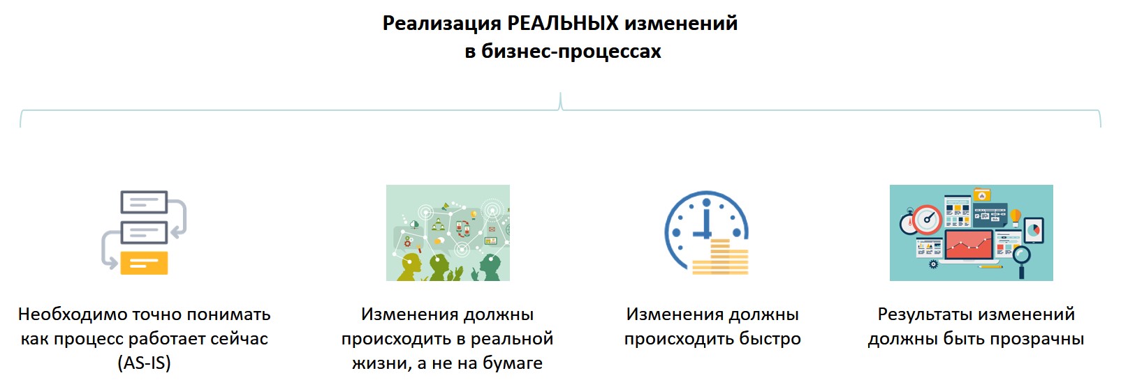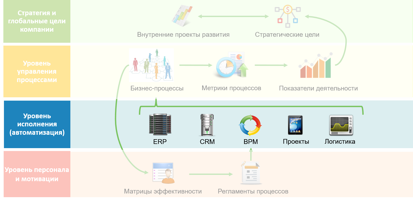 Таким образом реализуется система управления бизнес-процессами крупного предприятия. Ее задачей является не просто автоматизация. Она ориентирована на осознанное развитие процессов для достижения стратегических и глобальных целей компании.