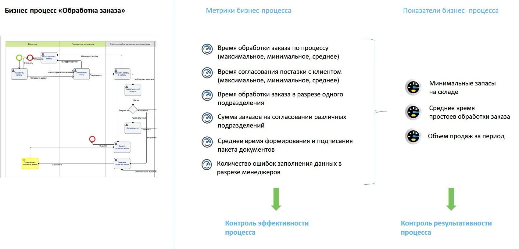 Например, в процессе «Обработка заказа клиента» можно выделить следующие метрики и показатели:
