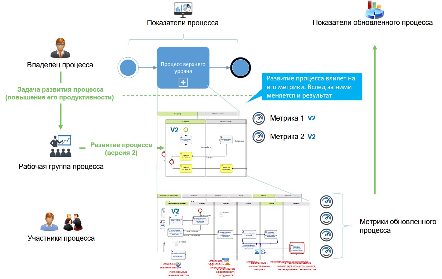 Соответственно, рабочей группе необходимо оптимизировать процесс, чтобы изменились его результаты. В работу запускается новые версии процессов, что соответственно декомпозируется дальше, на участников бизнес-процесса. В результате метрики обновленного процесса меняются, и на показателях процесса отражается результат.