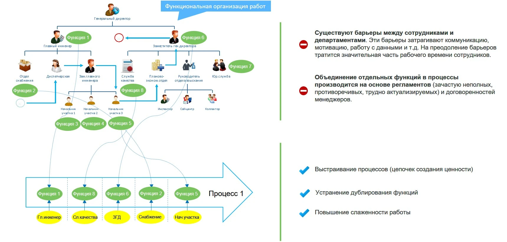 Перед руководством встает вопрос, как объединить людей и повысить слаженность работы компании? Наш ответ — взглянуть на управление бизнес-процессами. Нужно посмотреть, как функции различных отделов выстраиваются в цепочки создания ценности.