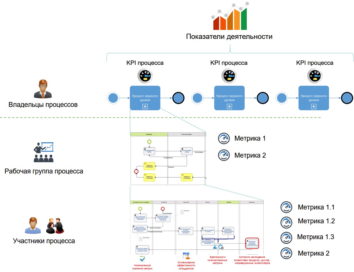 Но эти показатели — ведь они формируются на основе результативности бизнес-процесса. У него есть владелец, (например, руководитель департамента, реализующего данный процесс). Под ним еще несколько уровней иерархии вплоть до базовых участников процесса. И все они видят процесс, его эффективность и соответственно результаты своей работы по-разному.