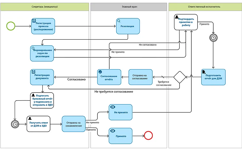 Кроме процесса подготовки к торгам, в BPM-системе также были автоматизированы процессы документооборота поликлиники. Это обеспечило оперативность работы с документами: подготовку, распространение, поиск, контроль сроков и качества предоставления. Были проработаны маршруты движения приказов, договоров, экспертиз, претензионной работы и пр. При работе с документами появилась возможность структурировать архивы, папки, файлы, а также обеспечивать безопасность данных за счет настроек прав доступа.