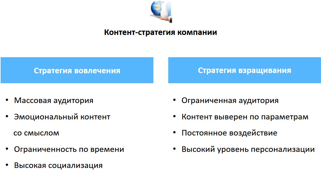Есть 2 типа контент-стратегий компании – стратегия вовлечения и стратегия взращивания клиентов. Подробнее о них поговорим в отдельной статье, поэтому просто перечислим основные характеристики: