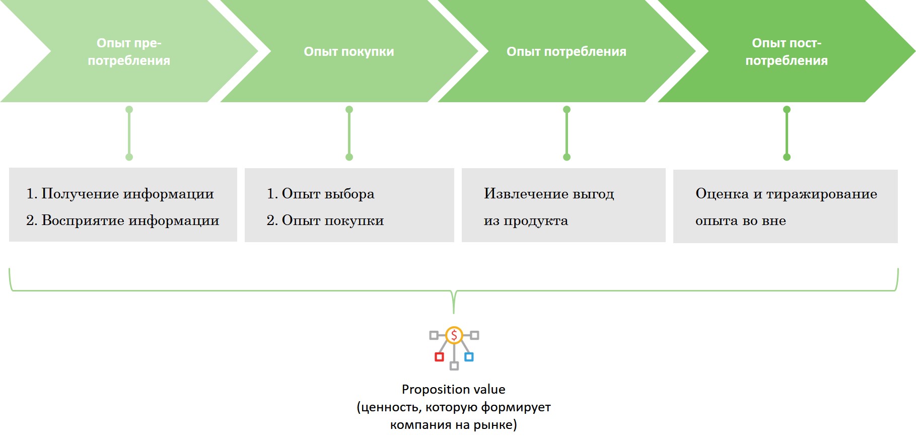 В процессе потребления продукта можно выделить 4 этапа: опыт пре-потребления, опыт покупки, этапы потребления и пост-потребления товара или услуги: