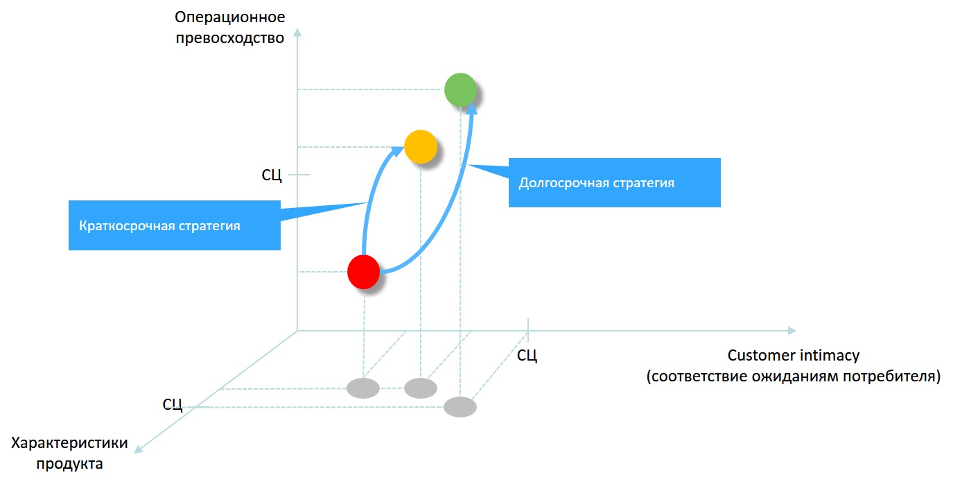 Краткосрочная стратегия развития компании направлена на улучшение характеристик по одному из трех факторов. В данном случае – операционное превосходство продукции. При этом компания постепенно подтягивает показатели по другим факторам до средних по рынку. В связи с ограниченными ресурсами, предприятие приближает к СЦ показатели соответствия ожиданиям потребителя (второй фактор), а характеристики продукта пока оставляет неизменными (третий фактор).