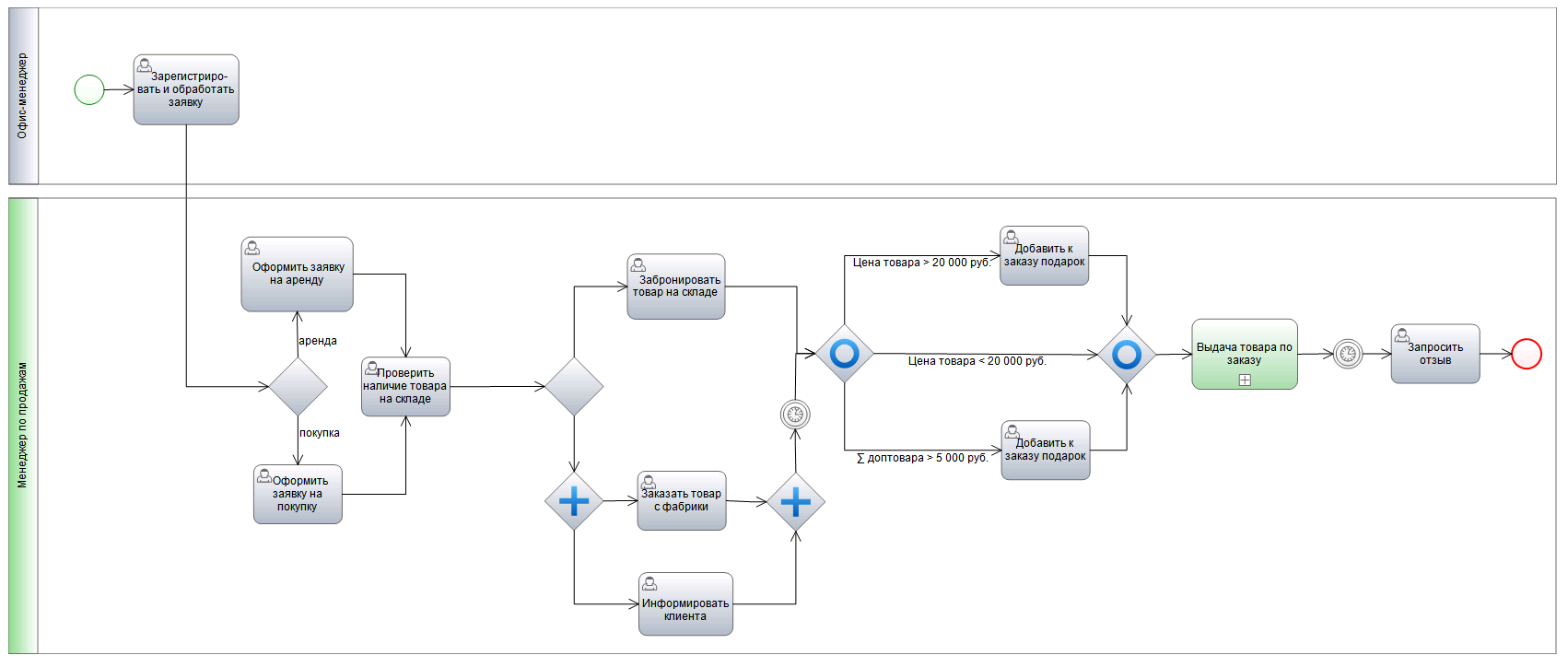 Дорожка фактически является зоной ответственности участника: любой элемент, помещенный в дорожку, выполняется исполнителем, прописанным в заголовке дорожки. Так, например, на рисунке 5 видно, что поток операций переходит из дорожки «Офис-менеджер» в дорожку «Менеджер по продажам». Задачу, находящуюся в дорожке «Офис-менеджера» исполняет именно офис-менеджер. В одном процессе может быть неограниченное количество Дорожек. Таким образом, можно описать всех участников процесса – поток операций будет определять, какие задачи, кем, в какой момент, и в каком порядке будут выполняться в рамках процесса.