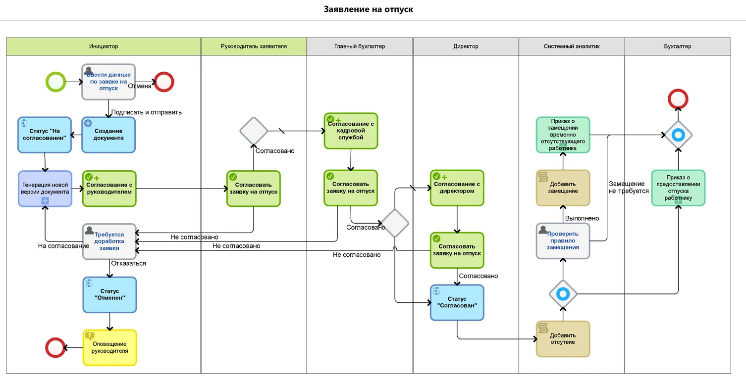 Практическое задание Для проверки усвоенного материала, предлагаем Вам попробовать свои силы в описании процессов. Возьмём простой процесс из жизни – «Предоставление отпуска сотруднику». Постарайтесь учесть все возможные условия, направления потоков операций, используя по максимуму элементы BPMN, рассмотренные в рамках двух Уроков. Для описания процесса предлагаем триал-версией системы ELMA365. Активировать бесплатную версию можно ЗДЕСЬ. Для проверки выполненного задания, Вы можете скачать наш вариант процесса, выполненного в дизайнере системы управления бизнес-процесса ELMA. |