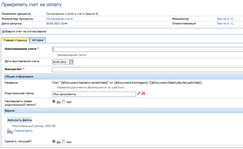 В рамках процесса любой сотрудник компании может запустить процесс согласования и оплаты счёта. Создание счёта в системе ELMA осуществляется путём заполнения формы с определёнными данными: наименование счёта (номер счёта), контрагент (наименование компании, выставившей счёт), указания места хранения счёта в системе. Сотруднику остаётся лишь внести необходимые данные и загрузить скан счёта.