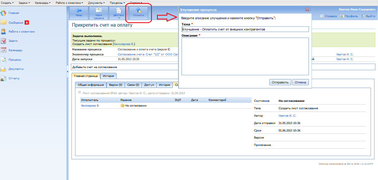 - ещё одна особенность системы ELMA - оповещение – сотруднику приходит оповещение о согласовании или не согласовании счёта (с указанием причин отказа). Это позволяет контролировать процесс, не тратя время на «дознание» руководителя о подписании, причинах отказа.