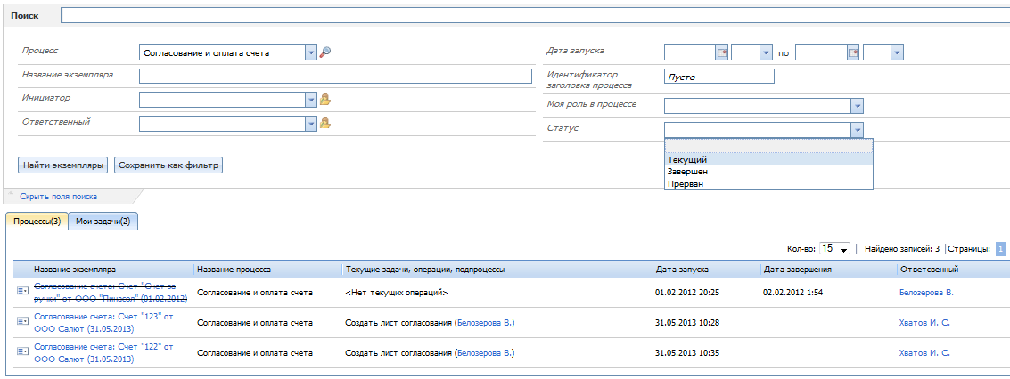 Контроль над процессами, в которых сотрудник является инициатором, участником или ответственным, осуществляется через Монитор процессов. Для каждого вида процесса создаётся отчёт, где отображается полная информация по всем экземплярам: статус, ответственный, текущие задачи по процессу, дата запуска-окончания процесса.