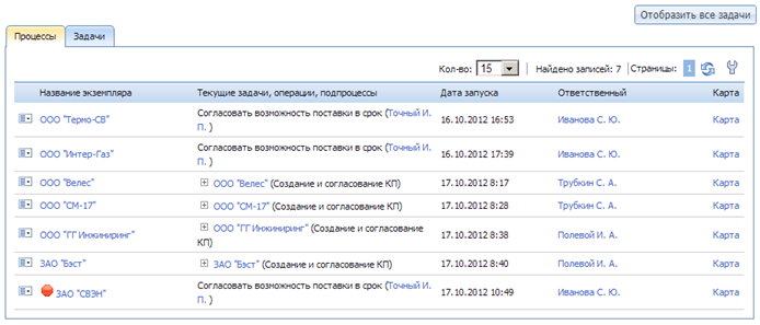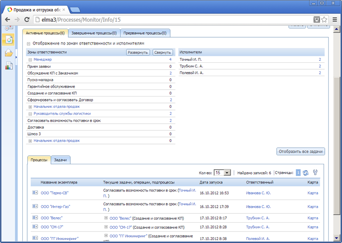 Процессы бывают большие – много участников, зон ответственности. Как понять, что творится в рамках данного процесса? Монитор процессов позволяет посмотреть на ситуацию «сверху» - он показывает, какие сейчас процессы проистекают в компании, на каких шагах находятся, кто за эти шаги отвечает.