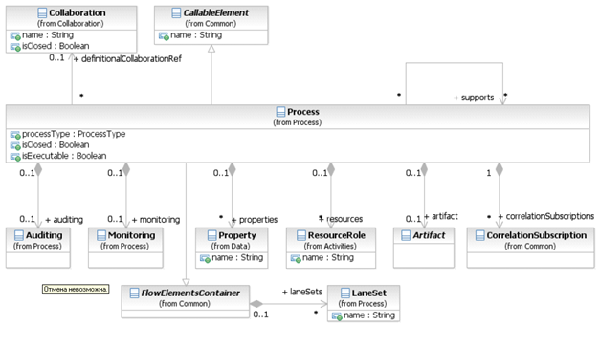 Атрибут processType обеспечивает наличие дополнительной информации о том, насколько абстрактен данный Процесс (насколько публичным он является). Публичный Процесс содержит только те элементы потока, которые являются важными для внешнего заказчика. Содержимое Процесса не моделируется. Такие Процессы доступны для ознакомления и могут быть использованы во Взаимодействии. Обратите внимание, что в BPMN 1.2 публичный процесс назван абстрактным. Приватный процесс является внутренним для данной организации. По умолчанию значение данного атрибута равно «none». |