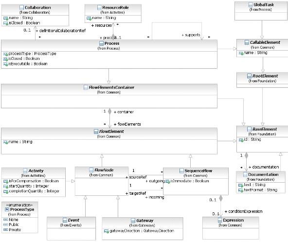 Пакет Процесса содержит классы, используемые для моделирования потока Действий, Событий и Шлюзов, а также служащие для описания последовательности их выполнения в ходе Процесса (см. фигуру 10.2). Если Процессу дано определение, оно помещается в Definitions.
