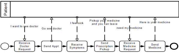Публичный Процесс подразумевает взаимодействие между приватным Бизнес-процессом и каким-либо другим Процессом или Участником (см. фигуру 10.5). Публичный Процесс содержит лишь те Действия или их последовательность, которые используются для изображения взаимоотношений с другими Участниками. Другие внутренние Действия приватного Бизнес-процесса в публичном Процессе не отображаются. Таким образом, публичный Процесс используется для передачи внешнему миру Сообщений или их последовательности, необходимых для взаимодействия с данным Бизнес-процессом. Публичный Процесс может быть моделирован как отдельно от Взаимодействия, так и внутри него, причем последнее используется для отображения обмена сообщениями между Действиями публичного Процесса и другими Участниками. Обратите внимание, что в BPMN 1.2 публичный Процесс назван абстрактным.