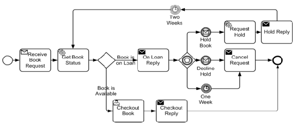 Приватный бизнес-процесс относится к внутренним процессам со специфической структурой. Такие Процессы, как правило, называются потоками работ или Процессами BPM (см. фигуру 10.4). Другое название этого процесса обычно используется для веб-сервисов и звучит как Оркестровка сервисов (Orchestrationof services). Существует два типа приватных Процессов: выполняемые и невыполняемые. Выполняемым называется Процесс, смоделированный для выполнения согласно семантике, описанной в Главе 14. Разумеется, в ходе разработки такого Процесса невозможно исключить отрезки, в которых не окажется достаточно информации для того, чтобы Процесс мог являться выполняемым. Невыполняемый процесс это приватный Процесс, моделируемый для подробного или не очень (решает разработчик модели) документирования поведения Процесса. Таким образом, информация, необходимая для выполнения Процесса (например, выражения формальных условий), как правило, не включается в невыполняемые процессы.