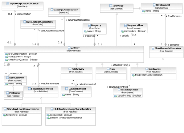 Класс Activity относится к абстрактным элементам и является сабклассингом элемента FlowElement (см. фигуру 10.6). Отдельно взятые подклассы Действия определяют дополнительные правила семантики, что в последующем определяет характерное для данного класса Действие.