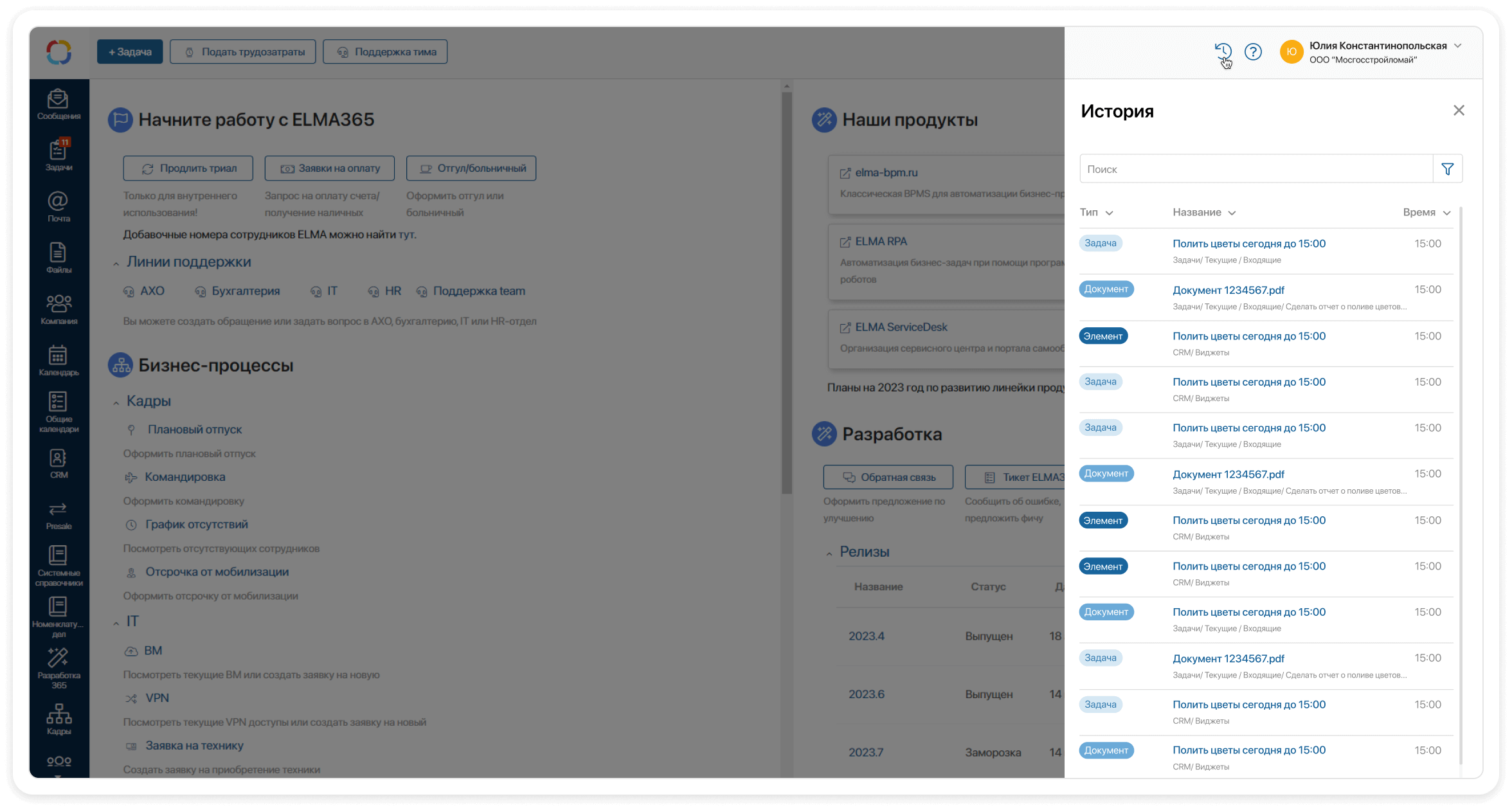 Виджет размещается на верхней панели, рядом с профилем пользователя и доступен на любой странице ELMA365, открытой в браузере или через приложение версии для ПК или мобильного телефона.