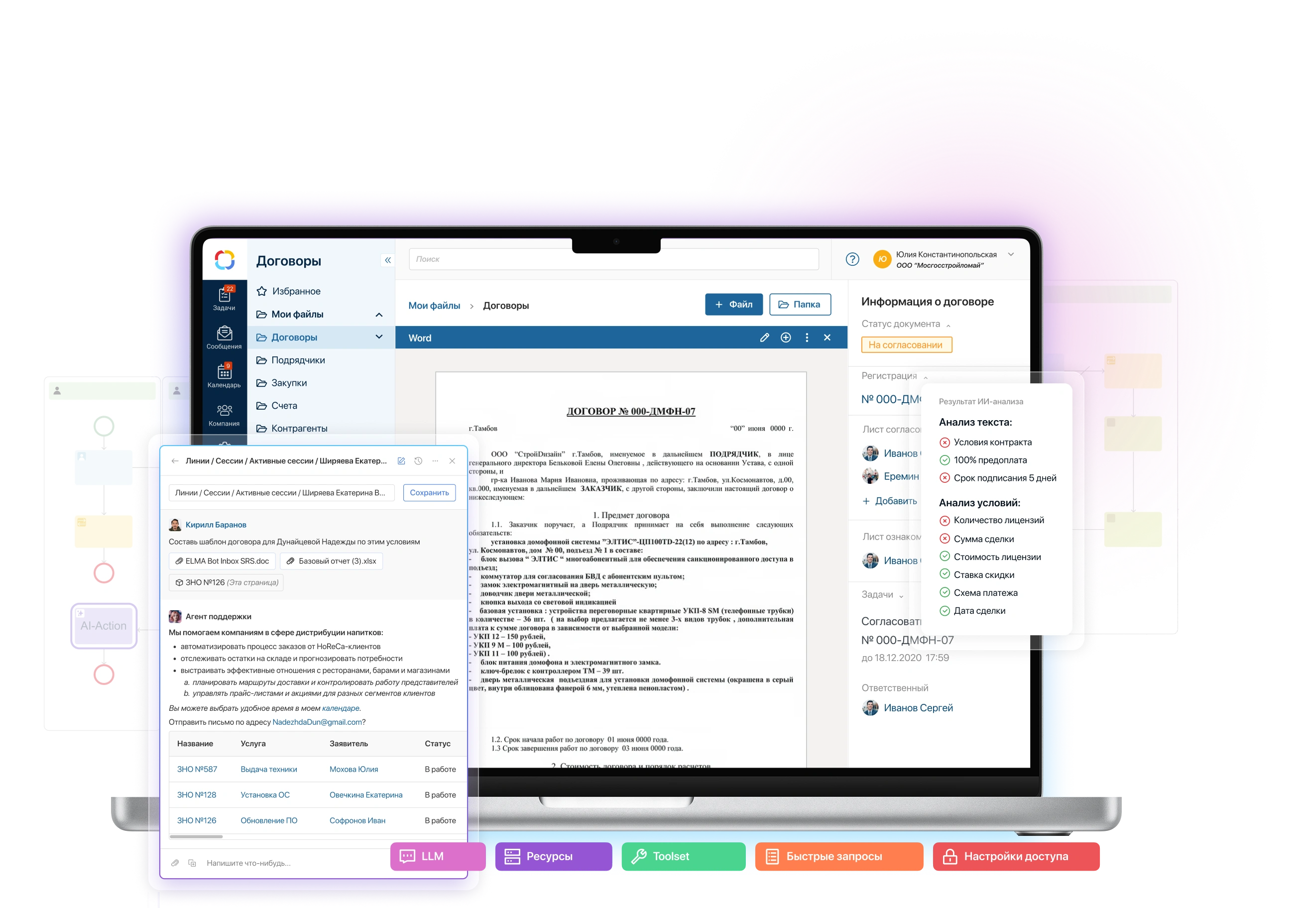 Благодаря интеграции с ELMA365 агент понимает контекст процессов, работает с корпоративными объектами и может выполнять реальные операции в системе.
