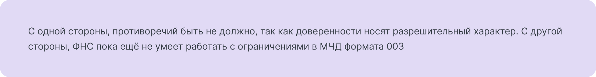 В таком случае возникает вопрос о том, какую из доверенностей считать действительной. Пока что нет четкого ответа на этот вопрос, так как Центральный портал регистрации и регулирования ФНС (ЦПРР ФНС) не обладает возможностью учета ограничений в МЧД формата 003.