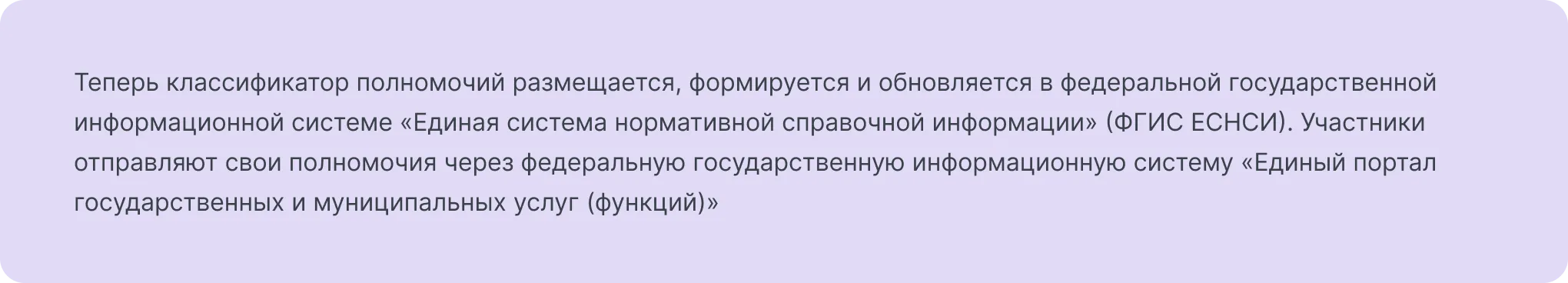 Доступ к классификатору полномочий осуществляется через ФГИС ЕСНСИ, включая систему межведомственного электронного взаимодействия. Классификатор полномочий формируется как набор справочников и включает полномочия от различных органов, таких как Минцифра, Минстрой, ФНС России, Федеральное казначейство, Центробанк и другие.