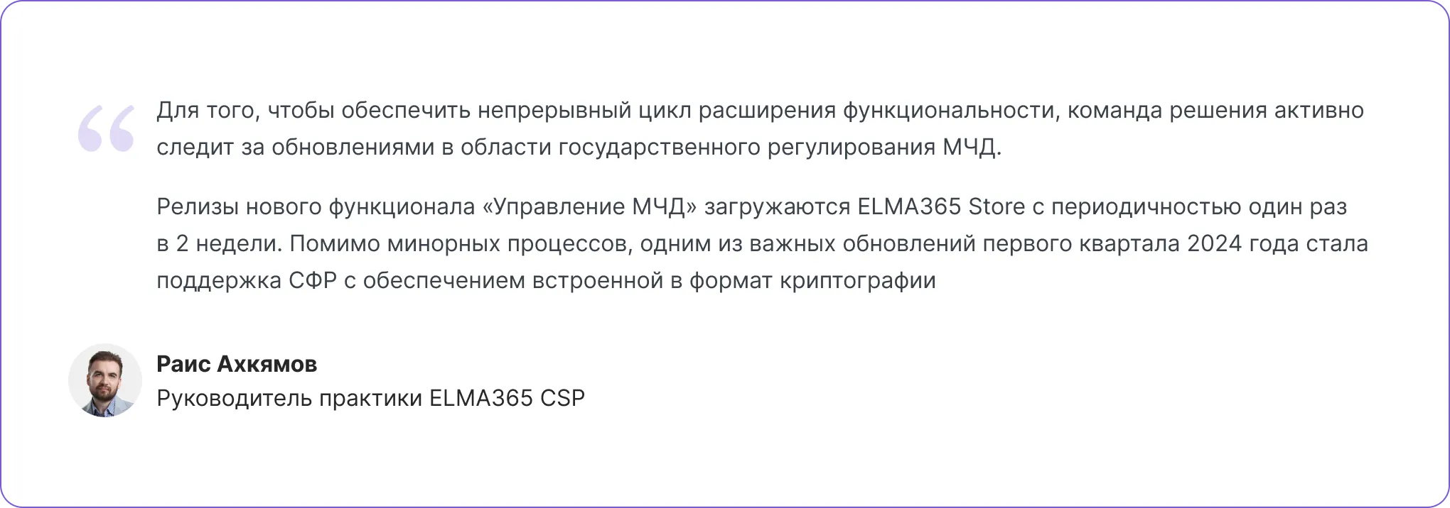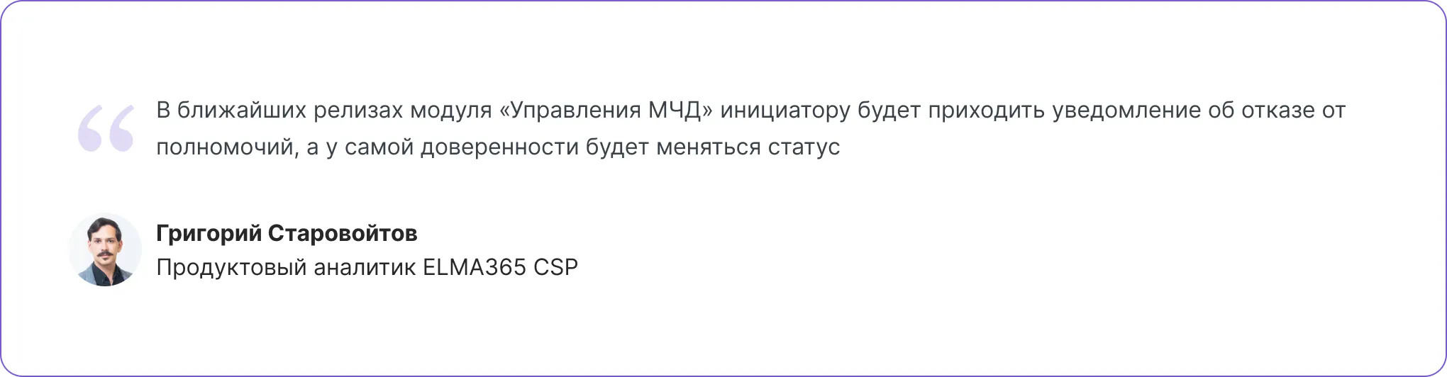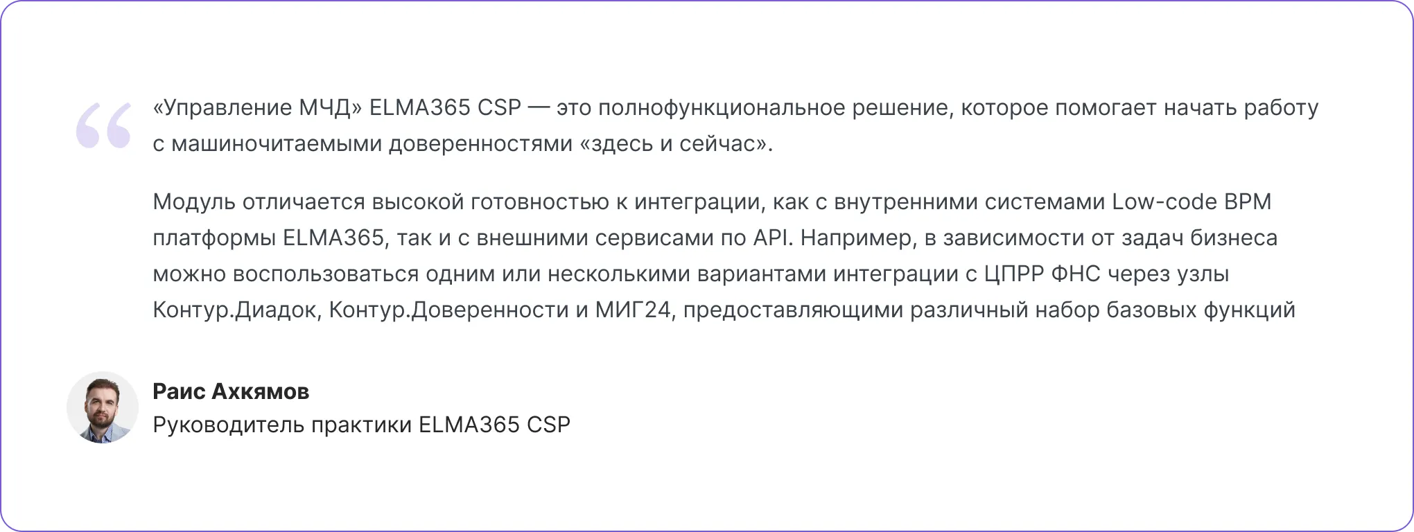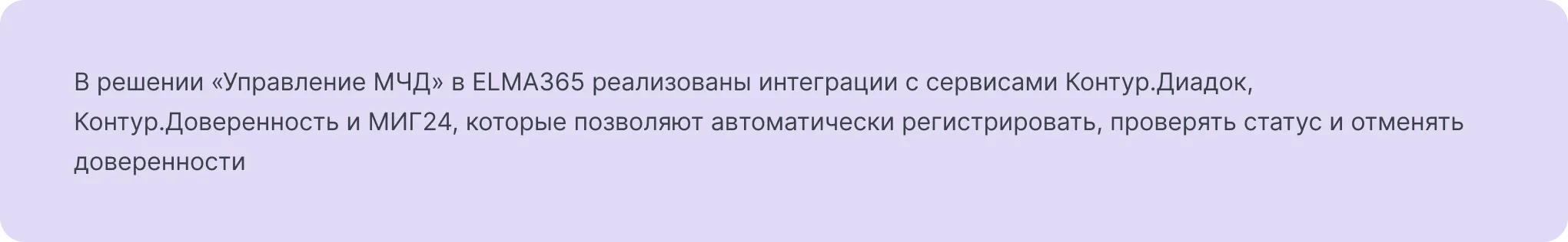 В решении «Управление МЧД» в ELMA365 реализованы интеграции с сервисами Контур.Диадок, Контур.Доверенность и МИГ24, которые позволяют автоматически регистрировать, проверять статус и отменять доверенности.